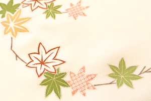 春秋文様では、菊と梅とか、紅葉と桜とかが代表的です。わかりにくいけど、山吹と萩とかも春秋といえます。桐と菊の組み合わせは桐の花は初夏だけど、春秋の一種といえると思います。変わり種として、楓だけで春秋を表すと青楓と紅葉が混在しているものがございます。