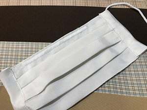 お客様から手作りマスクを頂いたの機に、自分でもミシンをガチャガチャやって作っています。気づけば、呉服屋にはいろんな布があるので、材料には困りません。ガーゼも目の粗いのから細かいもの、ガーゼより目の詰まった新モスという綿の生地。色々作って、それぞれのつけ心地を試して楽しんでます。ついでに、面白いから絹でやってみようと思い、羽二重で作ってみました。