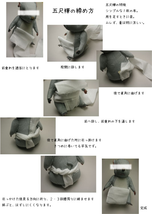 京濱のお薦めは越中より六尺、さらに、六尺を短くした五尺をお薦めいたします。五尺は長さ約五尺、巾約七寸の晒布。六尺の様に締めますが、最後は前垂れのままにしておきます。詳しくは下の画像をご覧ください。一枚の布なので、畳むときも楽でコンパクト。用を足すときも六尺の完全体よりも手軽です。さらに越中は臀部に布がありますが、五尺は六尺と同じ完全Tバックでスッキリさわやか。京濱では、五尺と六尺のみ扱っております。1個1100円です。ご依頼をいただいてからの製作になり、出来上がりまでに10日前後いただいております。